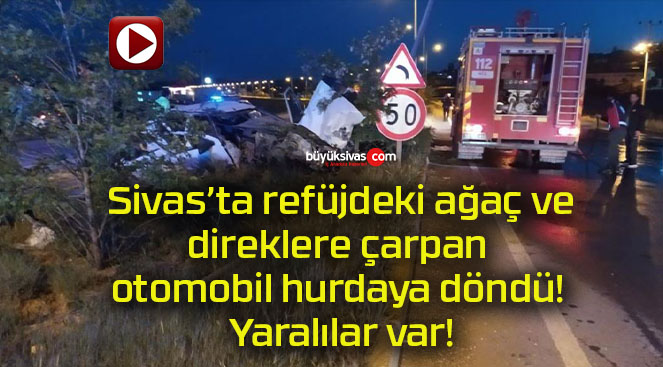 Sivas’ta refüjdeki ağaç ve direklere çarpan otomobil hurdaya döndü! Yaralılar var!
