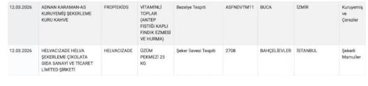 Denetimlerde FROPİEKİDS markasına ait fıstık kaplı vitaminli toplar olarak satılan üründe fıstık yerine bezelye kullanıldığı tespit edildi. Aynı listede yer alan Helvacızade markasına ait üzüm pekmezinde ise şeker ilavesi bulunduğu açıklandı.