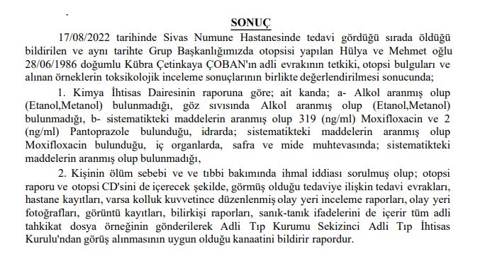 Ölümünün ardından Kübra Çetinkaya'nın otopsi raporun da "Kişinin ölüm sebebi ve ve tıbbi bakımında ihmal iddiası sorulmuş olup; otopsi raporu ve otopsi CD'sini de içerecek şekilde, görmüş olduğu tedaviye ilişkin tedavi evrakları, hastane kayıtları, varsa kolluk kuvvetince düzenlenmiş olay yeri inceleme raporları, olay yeri fotoğrafları, görüntü kayıtları, bilirkişi raporları, sanık-tanık ifadelerini de içerir tüm adli tahkikat dosya örneğinin gönderilerek Adli Tıp Kurumu Sekizinci Adli Tıp İhtisas Kurulu'ndan görüş alınmasının uygun olduğu kanaatini bildirir rapordur."