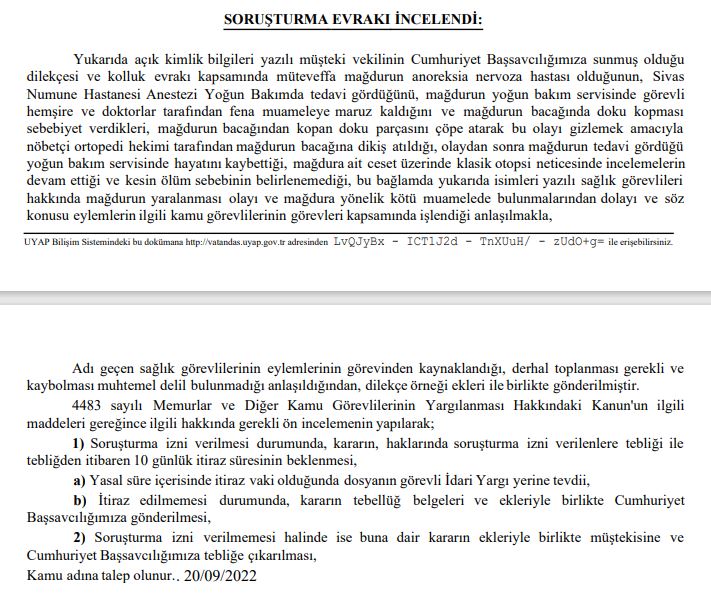 Ailenin avukatlığını yapan Hamza Nuh Özer’de “Biz gerekçelerimizi dilekçemizde yazdık ve sorumluların gereken cezayı alması için Hukuk Mücadelesi başlattık. Yaşananlar ve süreç Kübra Çetinkaya’nın ölümünde ihmal olduğu yönünde. Ben ailenin vekili olarak sonuna kadar mücadele edip suçun ve suçluların açığa çıkması için gereken her türlü girişimi yapacağım” dedi.