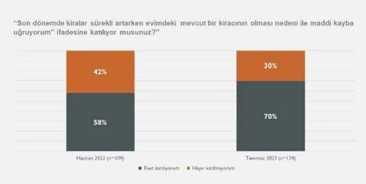 Öte yandan ev sahipleri ise, eski kiracılar nedeniyle maddi kayba uğradığını düşünüyor. ‘Kiralar sürekli artarken mevcut kiracılar maddi kayba uğruyorum’ diyen ev sahiplerinin oranı bir yılda yüzde 58’den yüzde 70’e yükseldi. Maddi kayba uğramadığını söyleyenlerin oranı da yüzde 42’den 30’a geriledi.