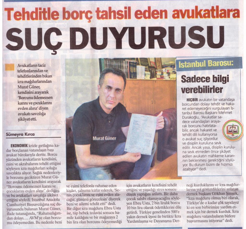Ekonomik krizle gırtlağına kadar borçlanan vatandaşın başı avukat bürolarıyla dertte. Borcu yüzünden avukatların kendisini eşini ve akrabalarını tehdit ettiğini söyleyen icra mağdurları soluğu savcılıkta alıyor.