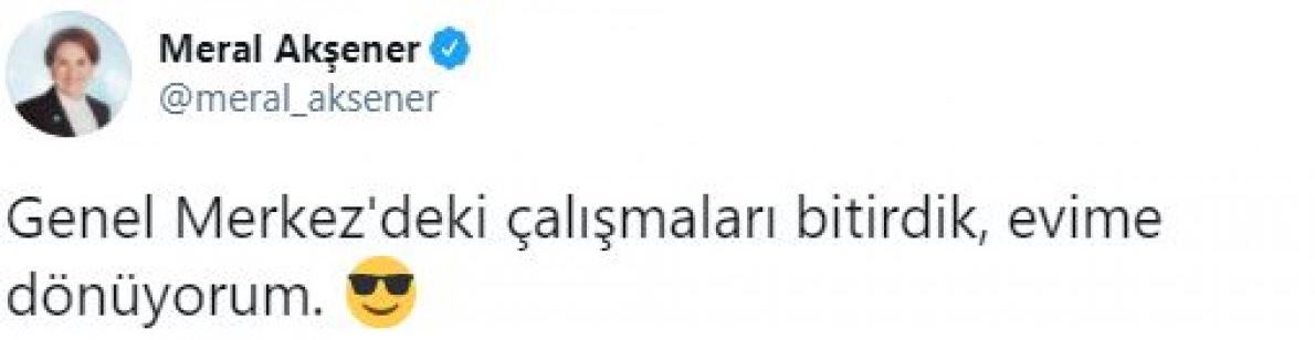 İyi Parti Genel Başkanı, fotoğrafına "Genel Merkez'deki çalışmaları bitirdik, evime dönüyorum." notunu düştü.
