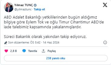 Bakan Tunç, sosyal medya hesabından yaptığı açıklamada, "ABD Adalet Bakanlığı yetkililerinden bugün aldığımız bilgiye göre Eylem Tok ve Timur Cihantimur, ABD'de iade talebimiz kapsamında yakalanmışlardır. Süreci Bakanlık olarak yakından takip ediyoruz." bilgisini verdi.