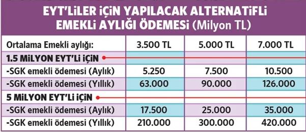 5 milyon EYT'linin emekli olması halinde ise 5 bin liralık maaş ortalamasında ek fatura 300 milyarı, 7 bin lira ortalamasında 420 milyar lirayı buluyor.