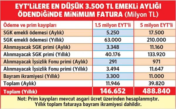 Böylece emekli aylığı, prim kayıpları ve bayram ikramiyesi dahil 1.5 milyon EYT'li için kaynak ihtiyacı ve gelir kaybı toplamı yıllık 146 milyar 652 milyon liraya ulaşacak. Yaklaşık 5 milyon EYT'linin emekli olması halinde ise en düşük fatura yıllık 489 milyar liraya dayanacak.