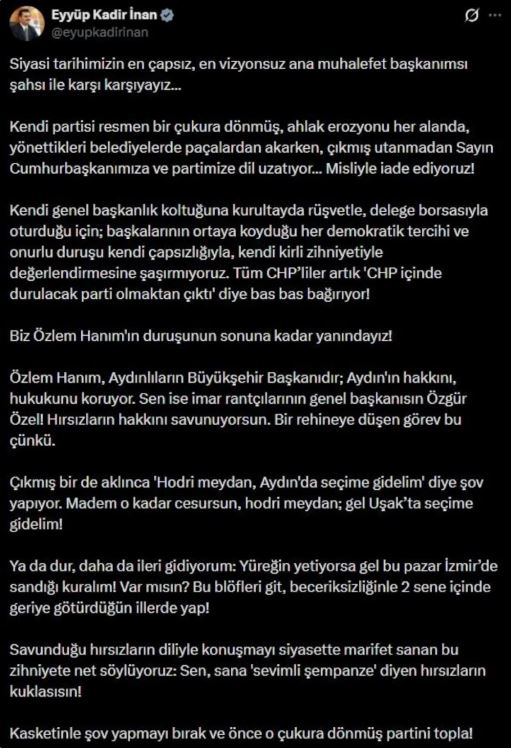 AK Parti Genel Sekreteri ve İzmir Milletvekili Eyyüp Kadir İnan, CHP Genel Başkanı Özgür Özel’in Aydın’ın Kuşadası ilçesinde yaptığı açıklamalara sert sözlerle karşılık verdi.