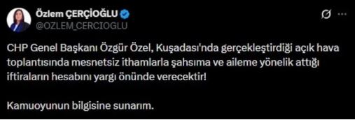 Öte yandan Aydın Büyükşehir Belediye Başkanı Özlem Çerçioğlu da konuya ilişkin açıklama yaptı. Çerçioğlu, Özel’in Kuşadası’ndaki konuşmasında kendisi ve ailesine yönelik mesnetsiz ithamlarda bulunduğunu belirterek, bu iddiaların yargı önünde hesabının sorulacağını ifade etti.