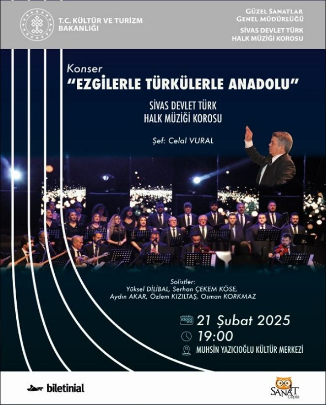 Türk halk müziğinin eşsiz ezgileriyle Anadolu’nun ruhunu yaşatacak "Ezgilerle Türkülerle Anadolu Konseri", 21 Şubat 2025 Cuma günü Sivas’ta sanatseverlerle buluşuyor.
