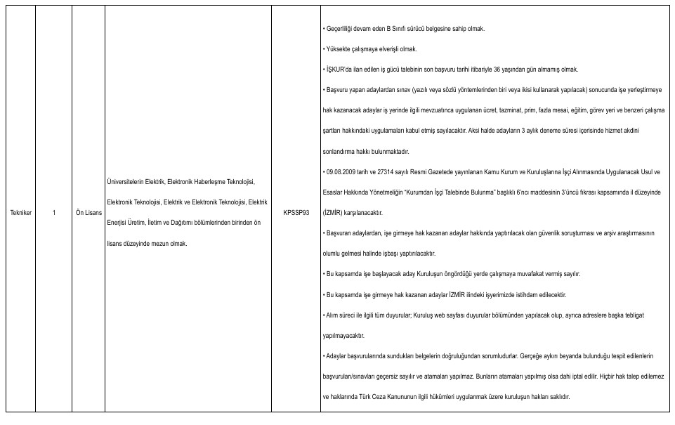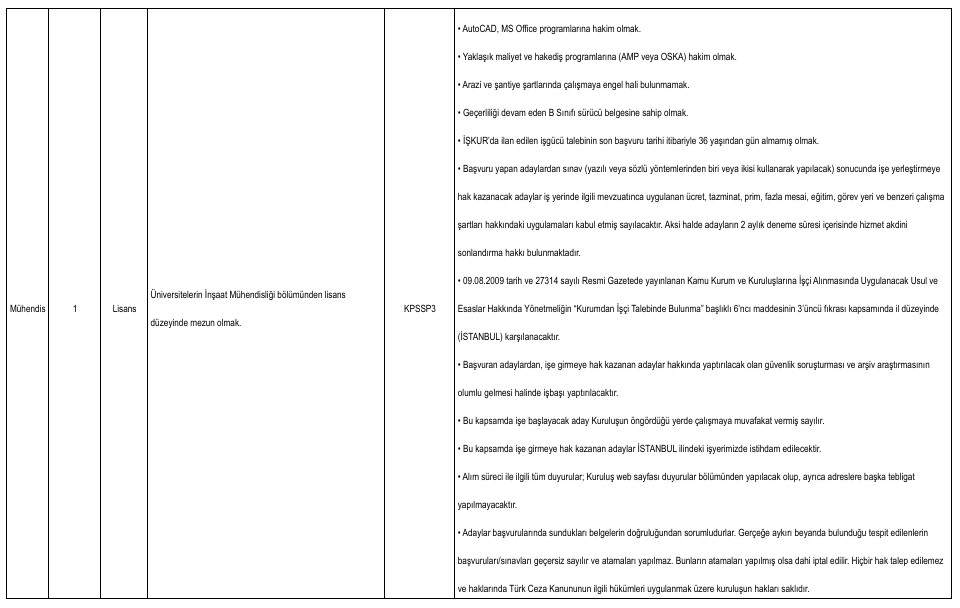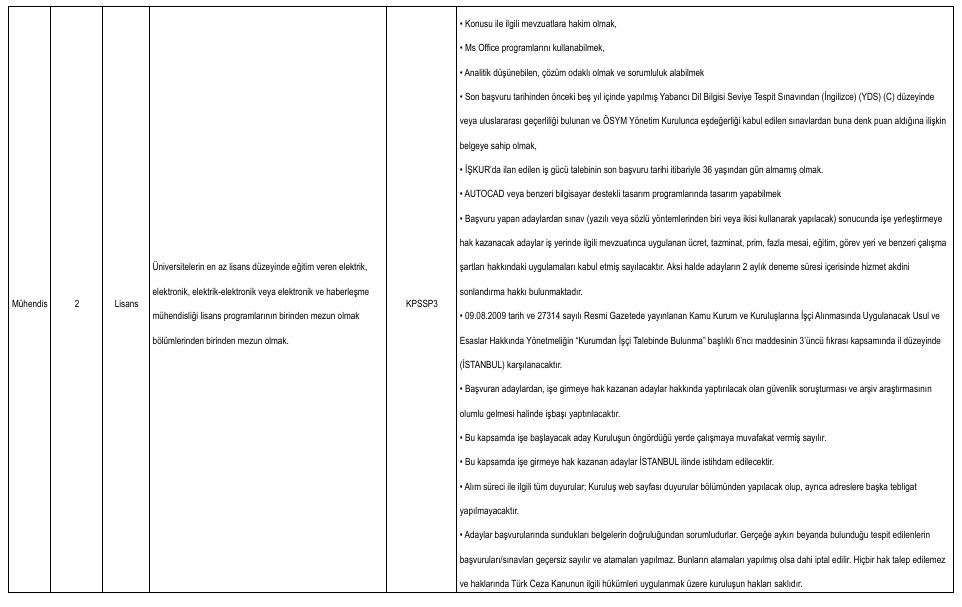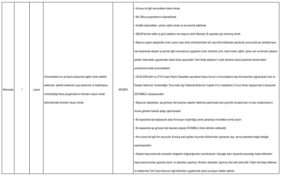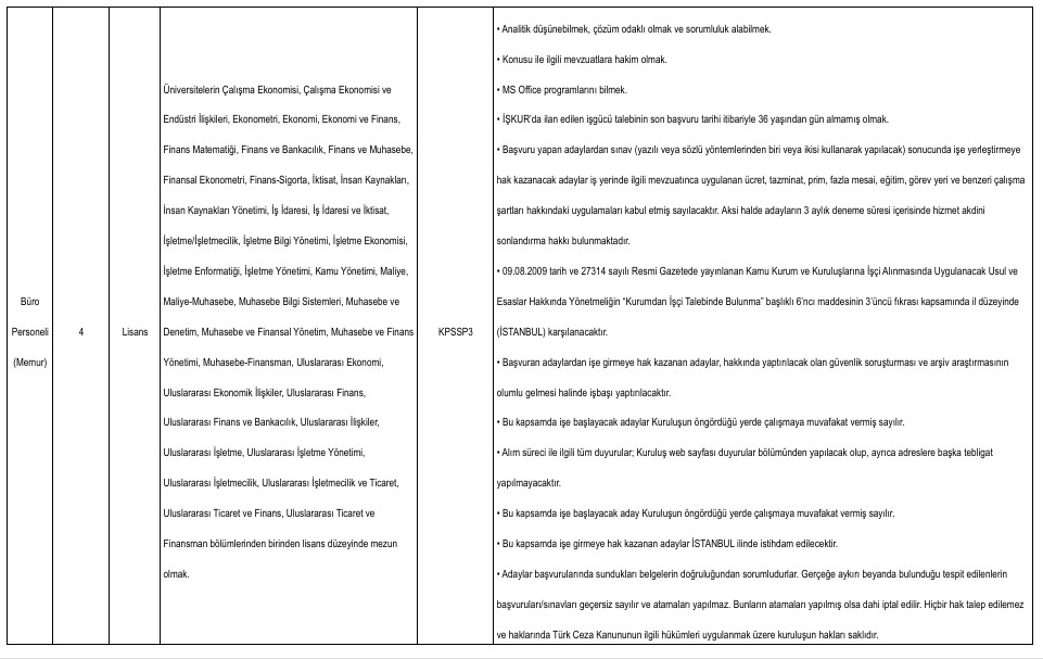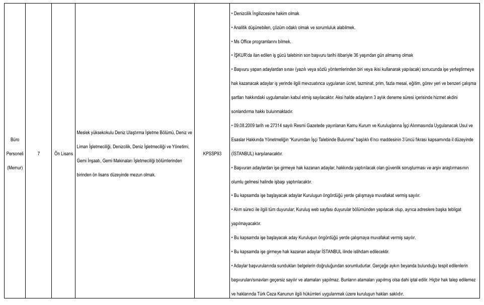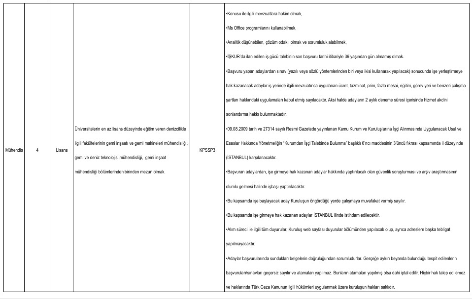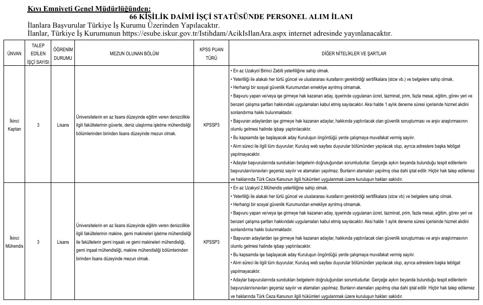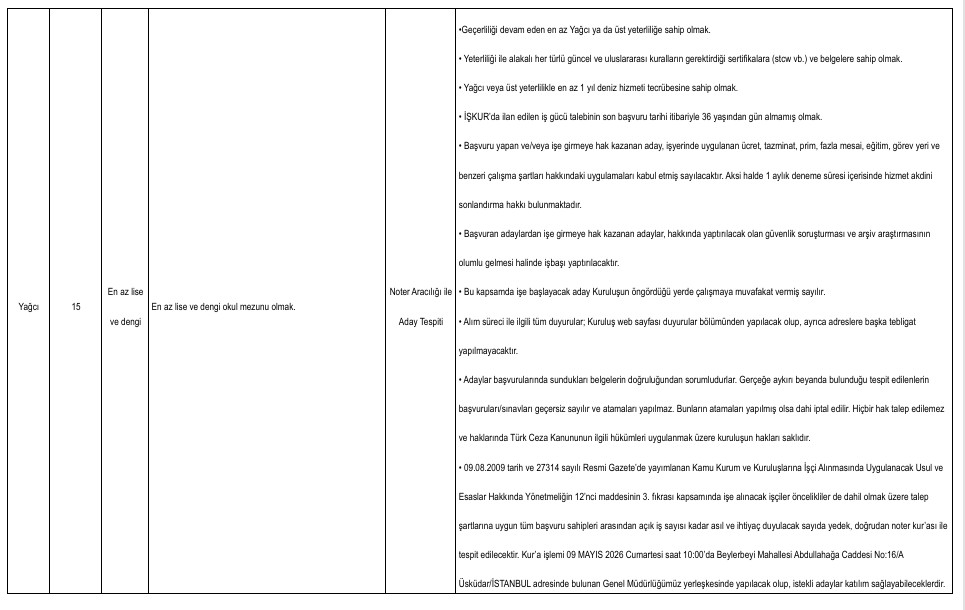 Yayımlanan ilana göre alımlar ikinci kaptan, mühendis, büro personeli, tekniker, gemici ve yağcı kadrolarında yapılacak. Adaylar başvurularını Türkiye İş Kurumu’nun resmi internet sitesi üzerinden veya İŞKUR hizmet merkezleri aracılığıyla gerçekleştirebilecek.