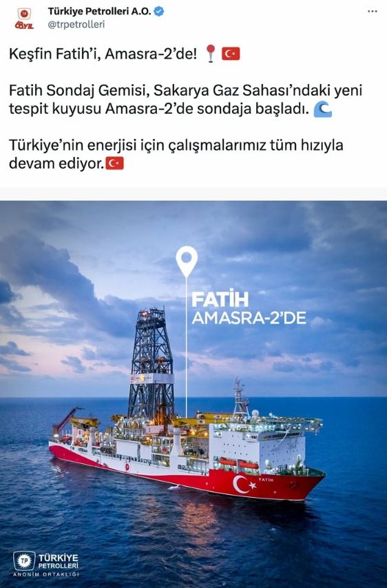 Türkiye Petrolleri Anonim Ortaklığı, Fatih Sondaj Gemisi'nin Amasra-2'de yeni sondaj çalışmalarına başladığını duyurdu.