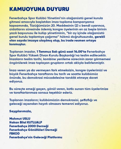 Eski yöneticiler Mahmut Uslu, Hakan Bilal Kutlualp ve kampanyayı yürüten taraftar gruplarının ortak açıklamasına göre, yeterli sayıda imzaya ulaşıldı. Toplanan imzalar, 1 Temmuz Salı günü saat 14.00’te Fenerbahçe Yüksek Divan Kurulu Başkanlığı’na teslim edilecek.
