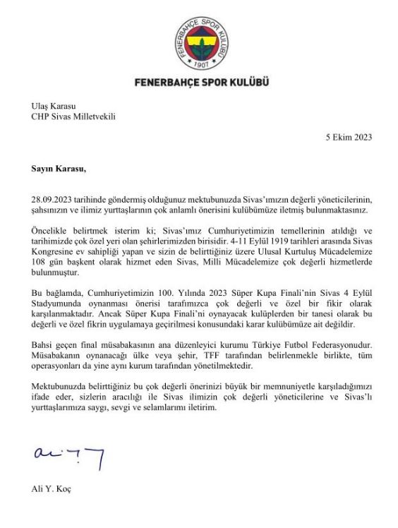 Yanıtta Ali Koç "Müsabakanın oynanacağı ülke veya şehir, TFF tarafından belirlenmekle birlikte, tüm operasyonları da yine aynı kurum tarafından yönetilmektedir" diyerek topu TFF'nin üzerine attı...