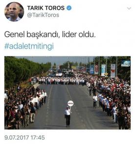 FETÖ'cü Bugün TV Eski Genel Yayın Yönetmeni Tarık Toros Twitter'dan CHP Genel Başkanı Kılıçdaroğlu'nun Maltepe'de gerçekleştirilen FETÖ'ye destek mitingini tebrik etti.