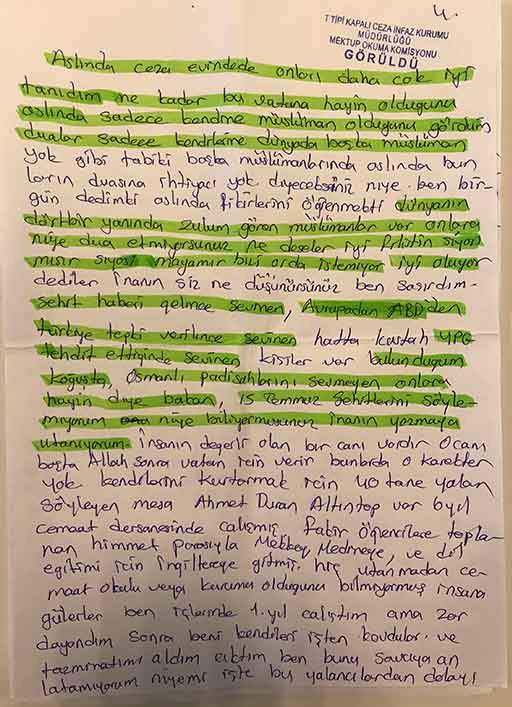 İşte H.B’nin gönderdiği mektupta yer alan bazı bölümler: “Ne derseler iyi... Filistin Siyon, Mısır siyasi, Myanmar bizi orada istemiyor. İyi oluyor dediler dediler. İnanın, siz ne düşünürüsünüz, ben şaşırdım. Şehit haberi gelince sevinen, Avrupa’dan, ABD’den Türkiye’ye tepki verilince sevinen, hatta YPG tehdit ettiğinde mutlu olan kişiler var bulunduğum koğuşta. Osmanlı padişahlarını sevmeyen, onlara hain diye bakan, 15 Temmuz şehitlerini söylemiyorum bile, niye biliyor musunuz inanın yazmaya utanıyorum.”