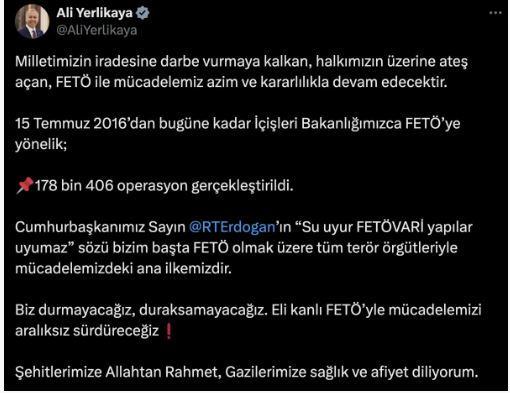 İçişleri Bakanı Ali Yerlikaya da FETÖ örgütüyle ilgili bir paylaşımda bulundu.