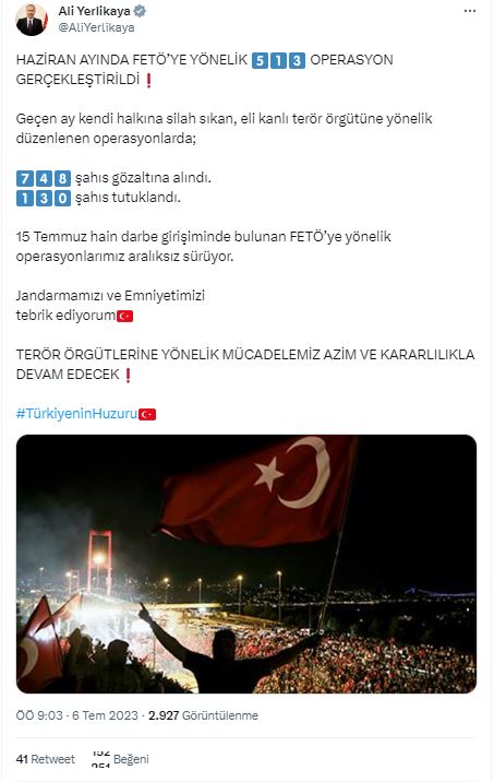 Bakan Yerlikaya yaptığı açıklamada: "HAZİRAN AYINDA FETÖ’YE YÖNELİK 5️⃣1️⃣3️⃣ OPERASYON GERÇEKLEŞTİRİLDİ❗️