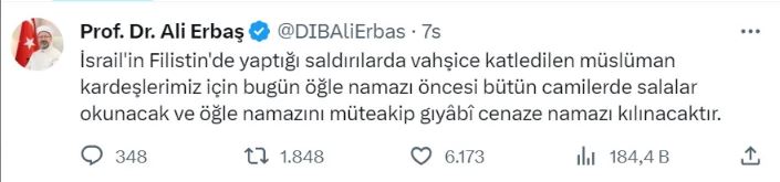 Diyanet İşleri Başkanı Erbaş, sosyal medya hesabından yaptığı açıklamada, “İsrail’in Filistin’de yaptığı saldırılarda vahşice katledilen Müslüman kardeşlerimiz için bugün öğle namazı öncesi bütün camilerde salalar okunacak ve öğle namazını müteakip gıyâbî cenaze namazı kılınacaktır” dedi.