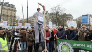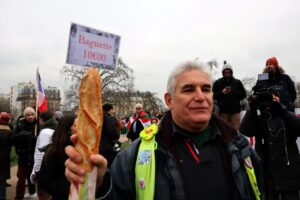 Ellerinde baget ekmekler ve Fransa bayrakları ile yürüyen fırıncılar, darağacına astıkları cansız manken ve getirdikleri tabut ile hükümete tepki gösterdiler.
