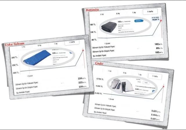 Karşılaştırmalı fiyat analizi yapan bir online satış platformunda incelediğimiz fiyat hareketlerine göre 6 kişilik bir çadır fiyatı 3 bin 454 TL iken, ihtiyaç listelerinin elden ele dolaşmaya başladığı deprem akşamında yüzde 60 artışla 6 bin 631 TL'ye fırladı. Yine başka bir satıcının geçen hafta 3 bin 750 TL'den sattığı çadır fiyatının 4 bin 841 TL'ye çıktığı görüldü.