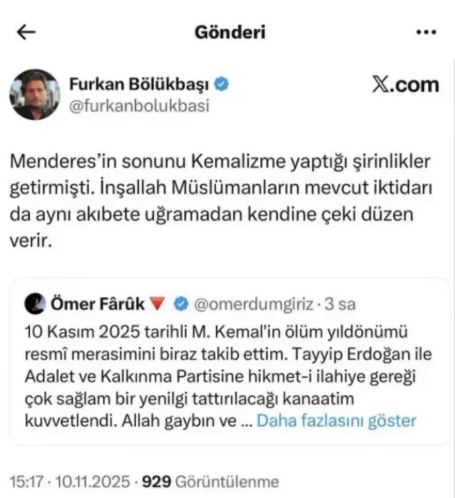 Sosyal medya platformu X (Twitter) üzerinden yaptığı paylaşım nedeniyle sosyal medya kullanıcısı Furkan Bölükbaşı, “Cumhurbaşkanına suikast ve fiili saldırı” suçlamasıyla gözaltına alındı.