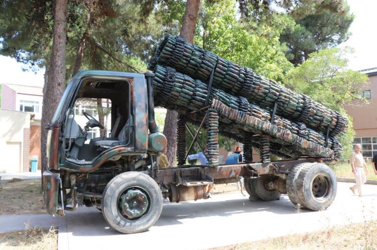Ondokuz Mayıs Üniversitesi (OMÜ) Güzel Sanatlar Fakültesi Öğretim Üyesi Prof. Dr. Metin Eker başkanlığındaki tasarım ve uygulama ekibi, Sıfır Atık Projesi ve atıktan sanata uygulaması kapsamında hurda kamyon, plastik şişe ve altyapı borusu kullanarak S-400’e benzeyen ‘mobil askeri füze rampası’ yaptı.