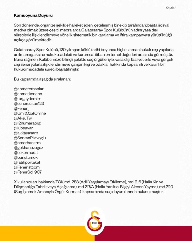 Galatasaray isim isim açıkladı.. Galatasaray Spor Kulübü, son dönemde kulüp hakkında yürütüldüğü belirtilen karalama kampanyasına karşı hukuki süreç başlattığını duyurdu. Kulüp, sosyal medya ve çeşitli mecralarda yapılan paylaşımlar nedeniyle aralarında tanınmış isimlerin de bulunduğu kişiler hakkında suç duyurusunda bulundu.