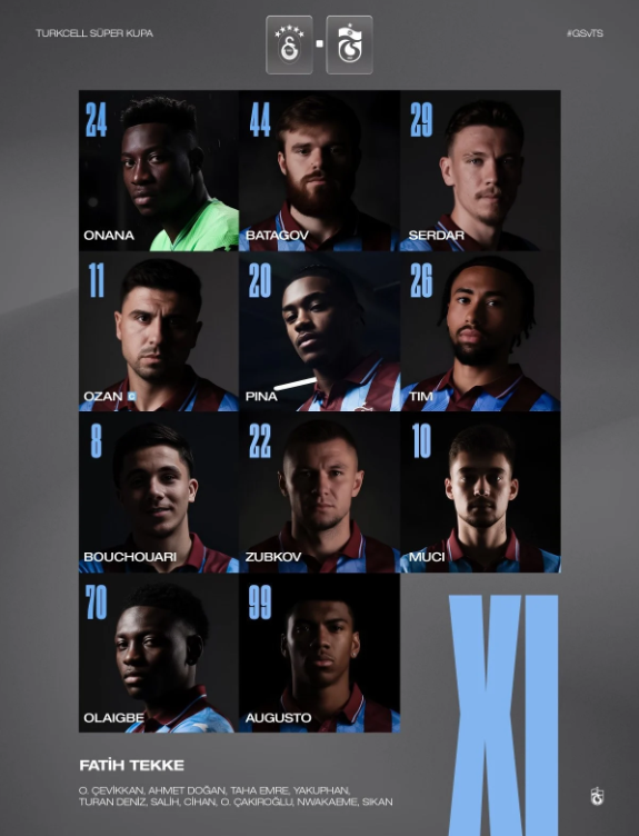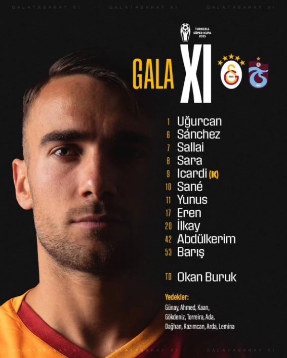 Galatasaray – Trabzonspor maçının ilk 11’leri belli oldu.. Galatasaray ile Trabzonspor, Süper Kupa yarı finalinde kozlarını paylaşıyor. Final bileti için büyük önem taşıyan mücadelede iki takım da sahaya en iyi kadrolarıyla çıkıyor.