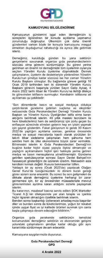 "Son dönemlerde basın ve sosyal medyaya oldukça çarptırılarak gündeme getirilen suçlama ve eleştiriler neticesinde Gıda Perakendecileri Derneği Yönetim Kurulu Başkan ve Yönetim Kurulu Üyeliğinden istifa etme kararı aldığımı belirtmek isterim. 49 yıllık mesleki tecrübem ile hem tüketicilerimiz hem de sektörümüz için zorlu geçen bu enflasyon sürecinde elimden gelenin hep en iyisini yapmak için gayret gösterdim. Fakat görüyorum ki gerek 30 Kasım 2022'de yaptığım açıklama sonrası, gerekse öncesinde medya ve sosyal mecralarda kasıtlı olarak yürütülen bir takım itibar zedeleme çalışmaları hem şahsıma hem sektöre hem de ülke ekonomisine büyük zarar vermekte. Bilinmesini isterim ki Gıda Perakendecileri Derneği'nin bugüne kadar hiçbir siyasi yapıyla ilişkisi olmamıştır ve yaptığım açıklamaların hiçbiri işini hakkıyla yerine getiren medya ve basın mensuplarına yöneltilmemiştir. Gündeme getirilen spekülasyonlar sonrası Sayın Devlet Bahçeli'nin hassasiyet gösterdiğini de üzülerek izledim. Maksadım asla kendisini kırmak değildi. Kusura bakmasınlar lütfen.