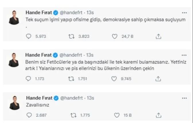 Tek suçum işimi yapıp ofisime gidip, demokrasiye sahip çıkmaksa suçluyum. Benim siz Fetöcülerle ya da başınızdaki ile tek karemi bulamazsanız. Yettiniz artık! Yalanlarınızı ve pis ellerinizi bu ülkenin üzerinden çekin. Zavallısınız."-internethaber