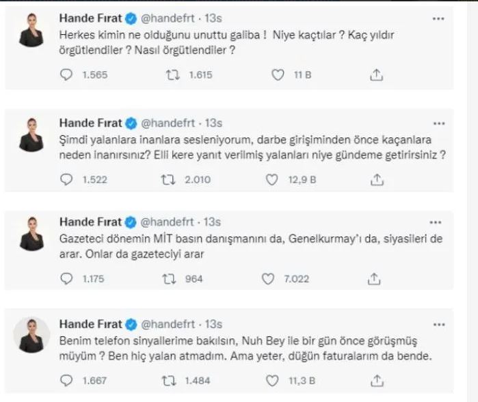 Fırat'ın 15 Temmuz'dan bir gün önce MİT'le görüştüğüne yönelik iddia çok sayıda kişinin hesaplarından paylaşılırken, gündemdeki gazeteci bu habere resmi Twitter hesabından yaptığı oldukça sert açıklamayla yanıt verdi. Hande Fırat, sosyal medya hesabından şu açıklamaları yaptı;
