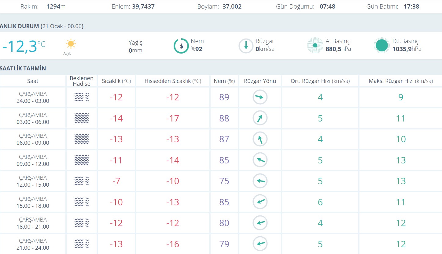 Saatlik tahminlere göre çarşamba günü boyunca hava sıcaklıkları sıfırın altında seyredecek. Gece yarısından sabah saatlerine kadar sıcaklığın eksi 14 dereceye kadar gerilemesi beklenirken, öğle saatlerinde dahi sıcaklığın eksi 7 derece civarında kalacağı öngörülüyor. Akşam ve gece saatlerinde ise hava yeniden eksi 12 ile eksi 13 derece aralığına düşecek.