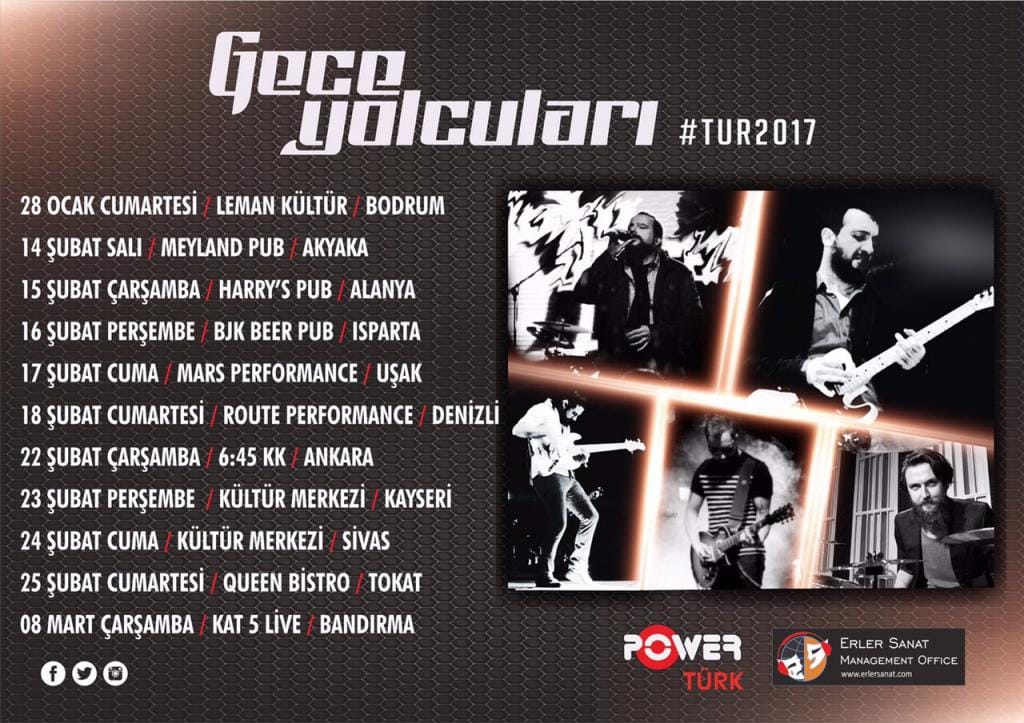 Power Türk ve Erler Sokağı sponsorluğunda turne gerçekleştiren Gece Yolcuları grubu, Nerdesin, Unut Beni Sevgilim gibi unutulmaz önemli eserleriyle 24 Şubat 2017 Cuma günü Kültür Merkezine gelerek sevenleriyle buluşacak.
