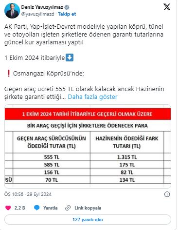 Yavuzyılmaz'ın açıklamasına göre, Osmangazi Köprüsü’nde geçen araç ücreti 555 TL kalırken, Hazine’nin garanti ettiği geçiş ücreti 1.870 TL’ye yükselecek.