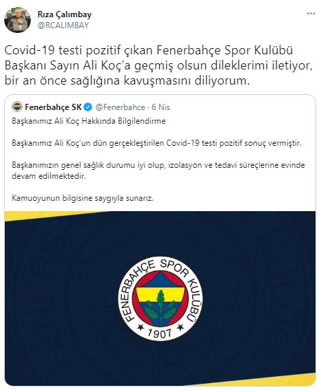 Rıza Çalımbay, sosyal medya hesabından paylaştığı geçmiş olsun mesajında, “Covid-19 testi pozitif çıkan Fenerbahçe Spor Kulübü Başkanı Sayın Ali Koç’a geçmiş olsun dileklerimi iletiyor, bir an önce sağlığına kavuşmasını diliyorum” ifadelerini kullandı.