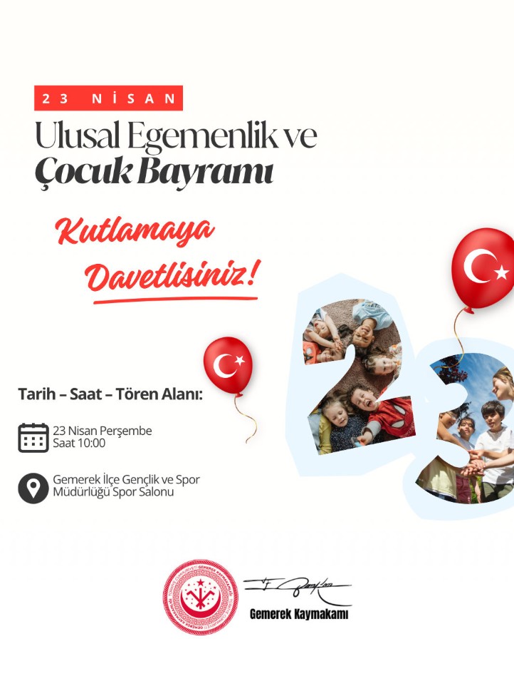 Gemerek’te 23 Nisan Kutlamaya Davet...Gemerek Kaymakamlığı, 23 Nisan Ulusal Egemenlik ve Çocuk Bayramı kapsamında düzenlenecek kutlama programına vatandaşları davet etti.
