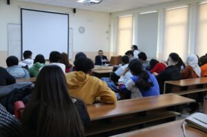 Fırat, genç iletişimcilere; ajans haberciliği, habercilikte gelişen ve değişen teknoloji kullanımı, etik ve dezenformasyon konularına değinerek deneyim ve tecrübelerini aktardı.