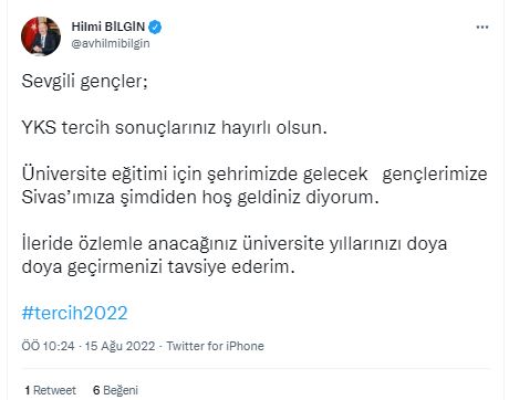 Sivas Belediye Başkanı Hilmi Bilgin YKS tercih sonuçlarının ardından sosyal medya hesabından açıklama yaptı.