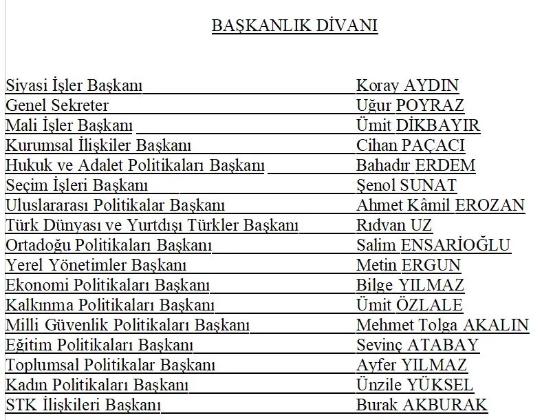 Türk Dünyası ve Yurt Dışı Türkler Başkanı Yavuz Ağıralioğlu‘nun yerine Rıdvan Uz getirilirken, Ağıralioğlu’na Başkanlık Divanı'nda yeni görev verilmedi. Gençlik Politikaları Başkanı Berna Sukas, Doğa ve Çevre Politikaları Başkanı Arzu Önşen ve Kadın Politikaları Başkanı Ayşe Sibel Ömeroğlu‘na da görev verilmedi.
