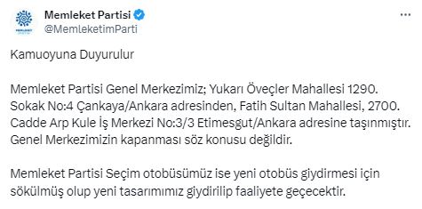 Memleket Partisi Seçim otobüsümüz ise yeni otobüs giydirmesi için sökülmüş olup yeni tasarımımız giydirilip faaliyete geçecektir." ifadelerine yer verildi. (Halil Yavuz Canpolat)