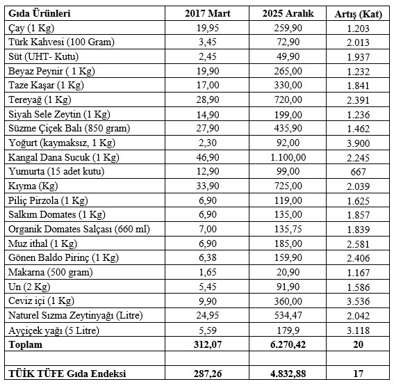 Hazırlanan tabloda çaydan süte, peynirden ete, yağdan bakliyata kadar temel tüketim ürünleri yer aldı. 2017 yılında toplamda 312,07 TL olan gıda sepetinin, 2025 yılı Aralık ayı itibarıyla 6.270,42 TL’ye yükseldiği hesaplandı. Bu da yaklaşık 20 katlık bir artış anlamına geliyor.