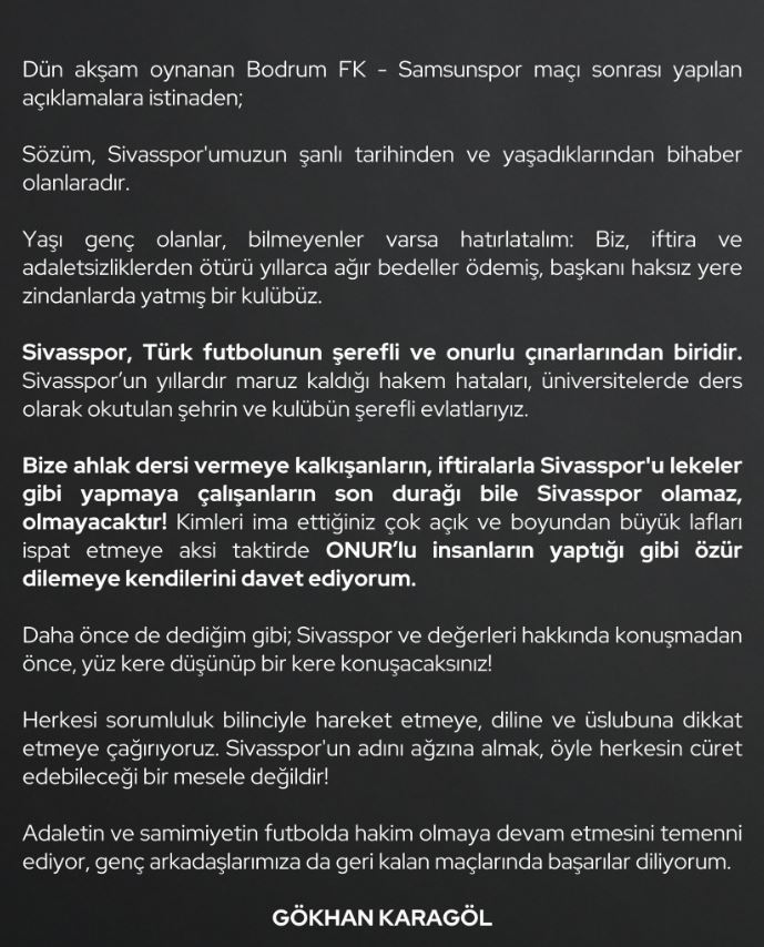Gökhan Karagöl, açıklamasında Sivasspor’un Türk futbolundaki şerefli ve onurlu geçmişine vurgu yaparak, iftira ve adaletsizliklere karşı yıllarca ağır bedeller ödemiş bir kulüp olduklarını hatırlattı. Karagöl, “Bize ahlak dersi vermeye kalkanların, iftiralarla Sivasspor'u lekeler gibi yapmaya çalışanların son durağı bile Sivasspor olamaz, olmayacaktır!” ifadelerini kullandı.
