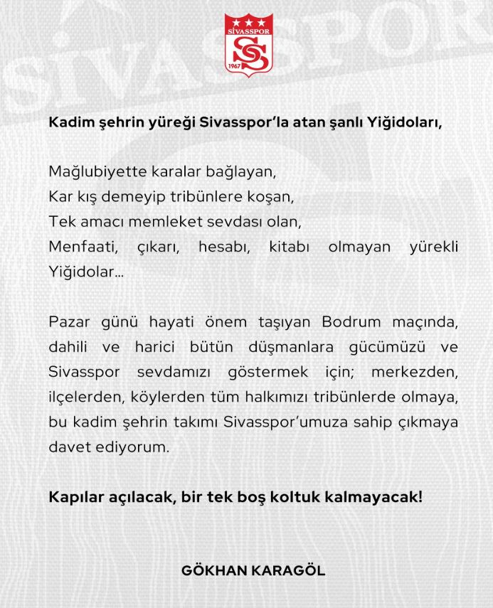 “Mağlubiyette karalar bağlayan, kar kış demeden tribünlere koşan, menfaat, çıkar, hesap kitap bilmeyen yürekli Yiğidolar…” ifadeleriyle başlayan çağrıda Karagöl, Sivasspor’a olan sevdanın hiçbir koşulda eksilmediğine dikkat çekti.
