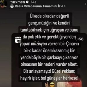 Şarkıcı, “Ülkede o kadar değerli genç, müziğini ve kendini tanıtabilmek için uğraşan ve bunu da çok etik ve gerektiği yerden yapan müzisyen varken; bir çınarın, bir o kadar önem kazanmış bir yerde böyle bir şarkıcıyı çıkarıyor olmasının bir nedeni vardır elbet.