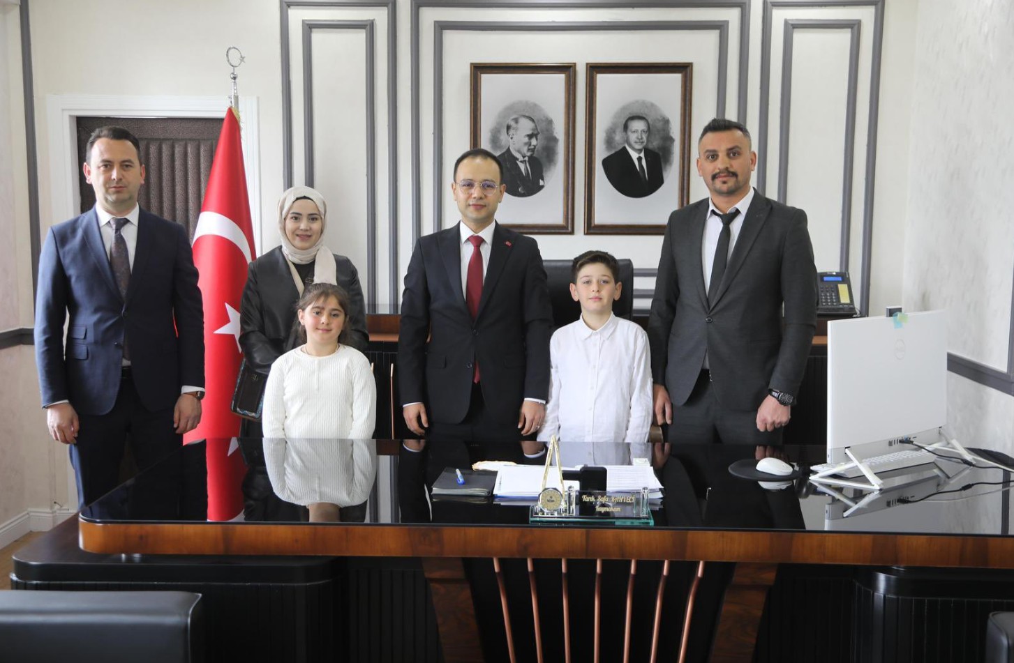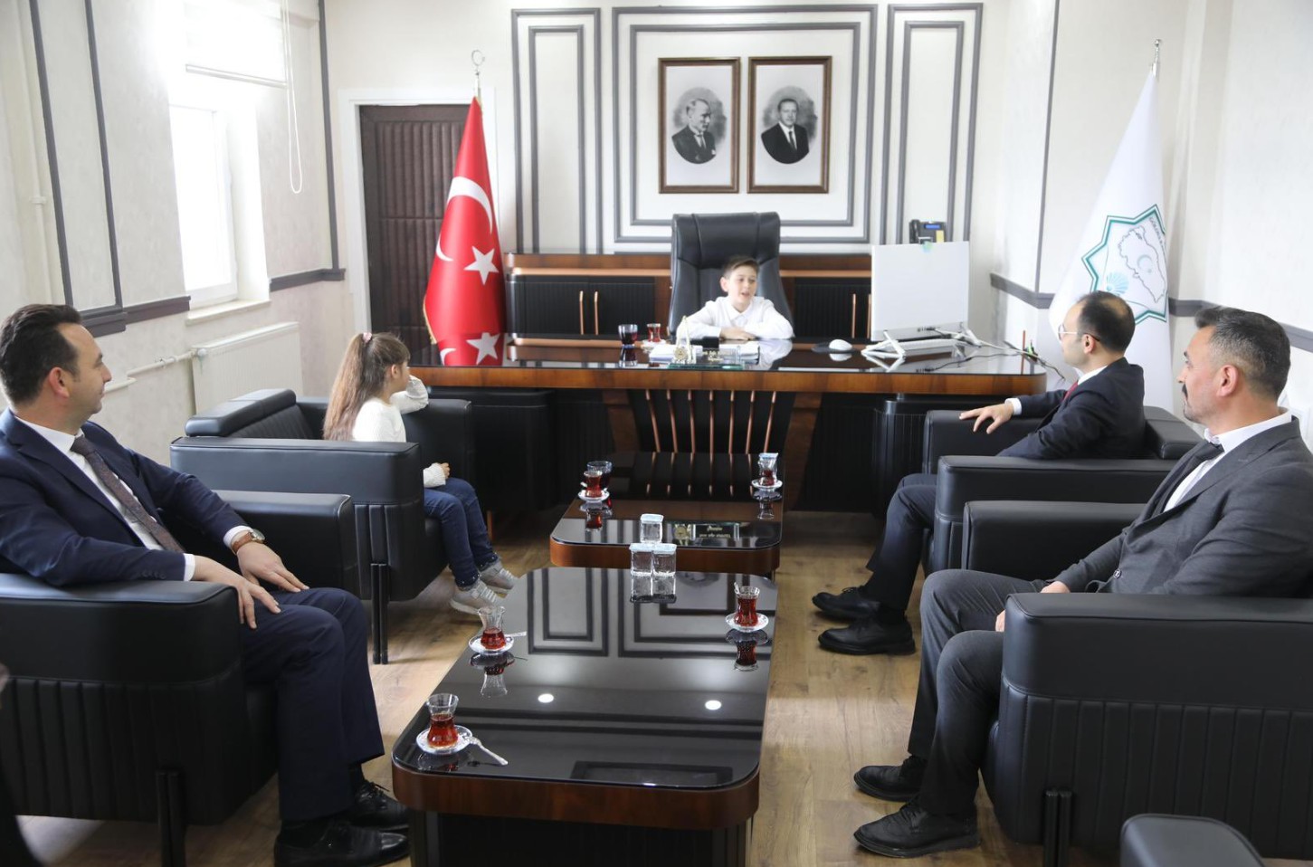 Kaymakam Tarık Safa Kahveci, Hasan Şakar Yatılı Bölge Okulu öğrencileri Nisa Nur Kaya ve Mustafa Efe Balın’ı makamında kabul ederek koltuğunu temsili olarak devretti.