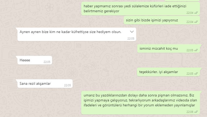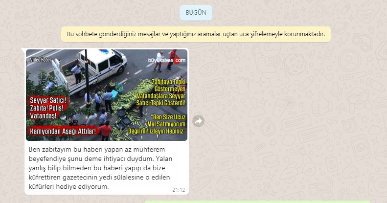 Gündüz saatlerinde yayınladığımız "SİVAS’TA SEYYAR SATICI İLE ZABITALAR ARASINDA YAŞANAN OLAY GÖRENLERİ ÜZDÜ" başlıklı haber sonrası Sivas Belediye'nde Zabıta olduğunu belirten Mücahit Koç isimli vatandaş WhatsApp hattımız 05558981558'e yazarak habere yapılan yorumlardaki küfürleri haberi yapan editörümüzün yedi sülalesine iade ettiğini ifade etti.