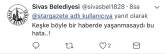 Haberin sosyal medyada paylaşılmasının ardından Sivas Belediye Başkanı Sami Aydın resmi twitter hesabından paylaşılan mesaja cevap olarak "Sehven yanlışlık olmuştur arkadaşlar. Nuh Albayrak bey müdahale eder misiniz" derken Sivas Belediyesi'nin resmi twitter hesabından ise "Keşke böyle bir haberde yaşanmasaydı bu hata..." ifadelerine yer verildi.