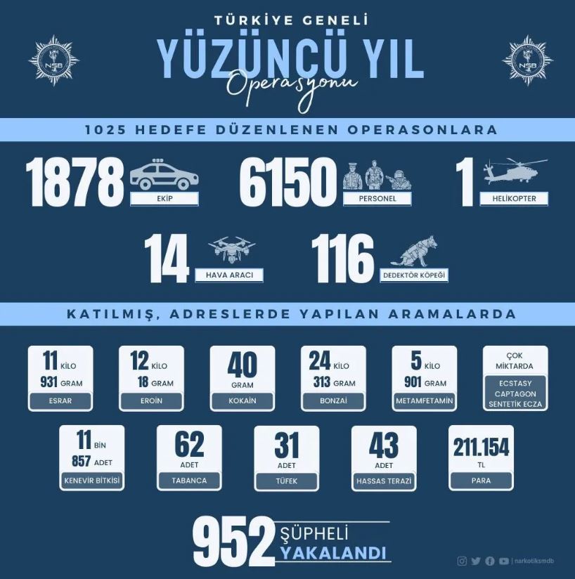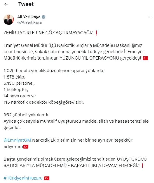 Bakan Yerlikaya, Twitter hesabından yaptığı açıklamada, "Emniyet Genel Müdürlüğü Narkotik Suçlarla Mücadele Başkanlığımız koordinesinde, sokak satıcılarına yönelik Türkiye genelinde İl Emniyet Müdürlüklerimiz tarafından 'Yüzüncü Yıl Operasyonu' gerçekleşti. 1025 hedefe yönelik düzenlenen operasyonlarda; 1878 ekip, 6 bin 150 personel, 1 helikopter, 14 hava aracı ve 116 narkotik dedektör köpeği görev aldı. 952 şüpheli yakalandı.