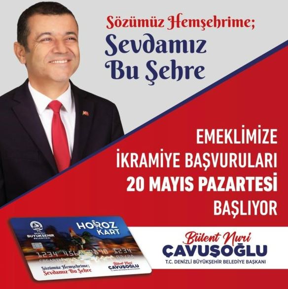 Denizli Büyükşehir Belediye Başkanı Bülent Nuri Çavuşoğlu'nun emeklilere müjdelediği 5 bin TL'lik ikramiye için başvurular 20 Mayıs Pazartesi günü başlıyor. Sosyal yardım kriterlerini taşıyan emekliler, "bir elin verdiğini diğer el görmeyecek" hedefiyle hayata geçirilecek. "Horoz Kart" ile bu destekten yararlanabilecek.