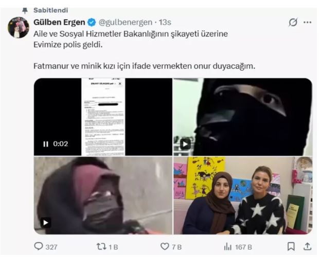 Gelişmeyi sosyal medya hesabından duyuran Gülben Ergen, Aile ve Sosyal Hizmetler Bakanlığı’nın şikayeti üzerine polis ekiplerinin evine geldiğini açıkladı. Ergen paylaşımında, “Fatmanur ve minik kızı için ifade vermekten onur duyacağım” ifadelerini kullandı.